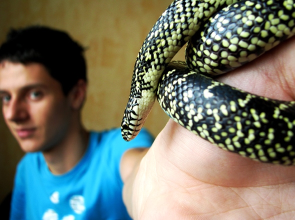 My most recent dream was… all over the place, to say the least. But to make a long story short, at the end of the dream, I was sitting up in a bed, it was during the day because the sun shone bright through a window just behind me. For some reason, I looked down and saw a group of cute, young rats. They were pets, this I know because they were dressed up and were being fed treats. But they weren’t my pets. I remember some where all white and some were black and white. Then two unfamiliar children came to the door, one carrying treats for the baby rats and the other carrying a blue adult rat. As they fed the babies more treats, I stood from the bed and started down the hall where the two strange children had just come from. I exited a door and it was then that I noticed the snake that I was carrying. A green snake smiled up at me as I took a seat on the porch fence. I can’t remember what the snake was saying, but I remember that it was friendly and I wasn’t afraid of it at all. I lowered the snake onto the porch where there were more rats and the snake was just about to eat one when I grabbed it by the tail and started pulling it away. Just as I was placing it back in my hand a cat appeared, hissing fiercely at us. The snake was afraid, but while the sudden appearance and the cat surprised me, I wasn’t afraid of it. Then I stood to walk away and that’s when I woke up.